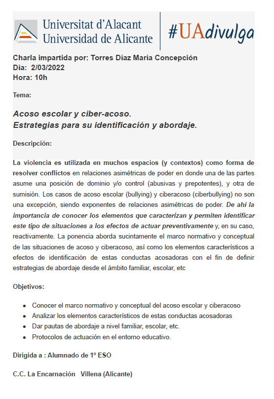 El próximo 2 de marzo tendrá lugar la Charla-taller «Acoso escolar y ciber-acoso. Estrategias para su identificación y abordaje» en el Instituto de Educación Secudaria C.C. La Encarnación de Villena, a cargo de la profesora y abogada, Dra. Concepción Torres, en el marco de las acciones de divulgación de la Universidad de Alicante #UAdivulga.