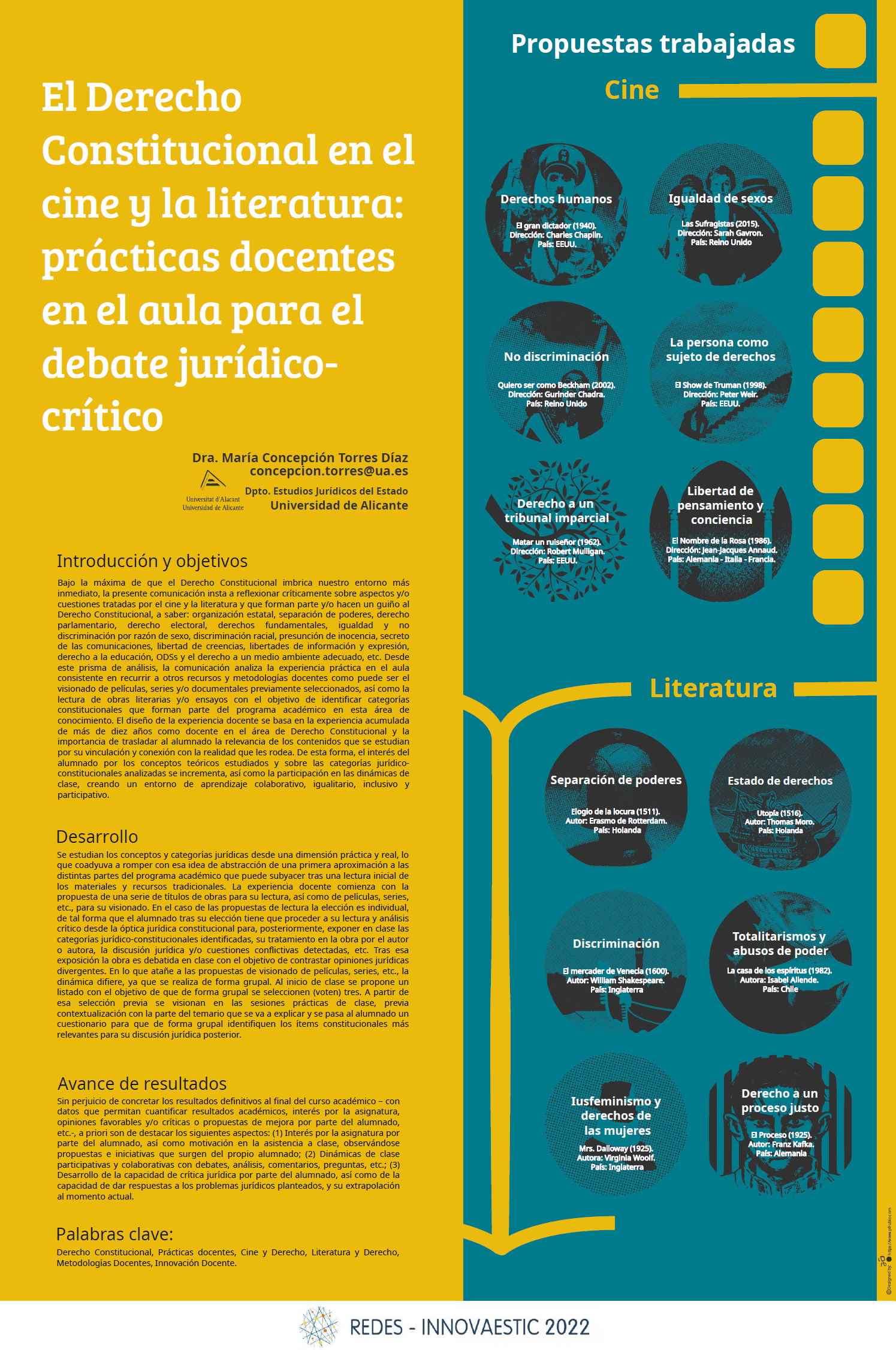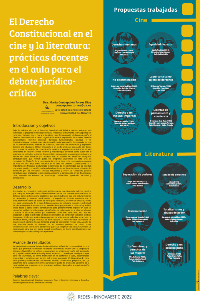 Los días 13 a 14 de junio de 2022 tendrá lugar en la Universidad de Alicante el Congreso Internacional Redes-Innovaestic 2022 «El profesorado, eje fundamental de la transformación de la docencia universitaria». La profesora Dra. Concepción Torres participa con la siguiente comunicación-póster: «El Derecho Constitucional en el cine y la literatura: prácticas docentes en el aula para el debate jurídico-crítico».