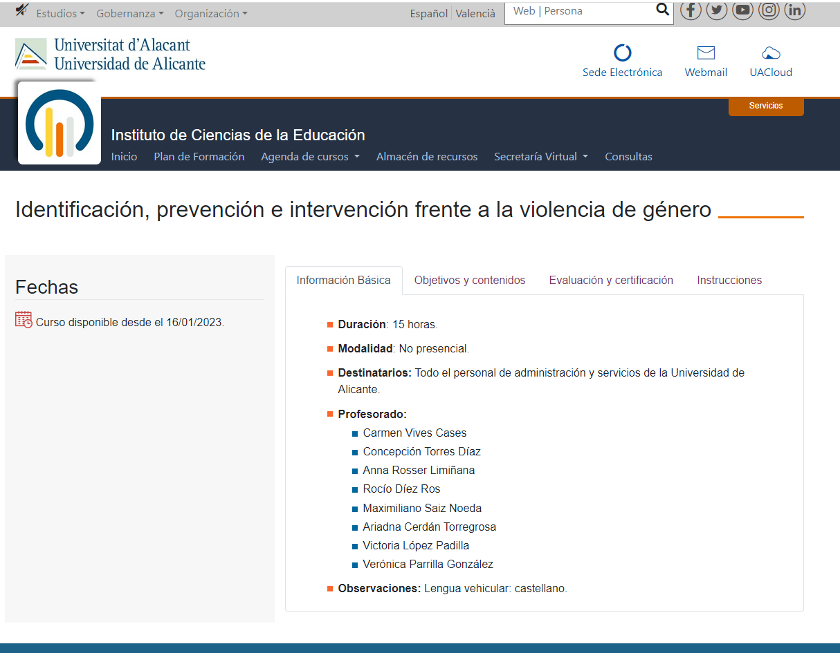 Curso especialización: «Identificación, Prevención e Intervención frente a la violencia de género». Cód. 20230247. Información aquí: https://cvnet.cpd.ua.es/Guia-Docente/GuiaDocente/Index?wlengua=es&wcodasi=20230247&scaca=2023-24#. Información curso 2023-2024: https://web.ua.es/es/unidad-igualdad/2-sensibilizacion-y-formacion/formacion/curso-identificacion-prevencion-e-intervencion-vm/curso-identificacion-prevencion-e-intervencion-frente-a-la-violencia-machista.html. Más información aquí: . Guía Docente en pdf: .