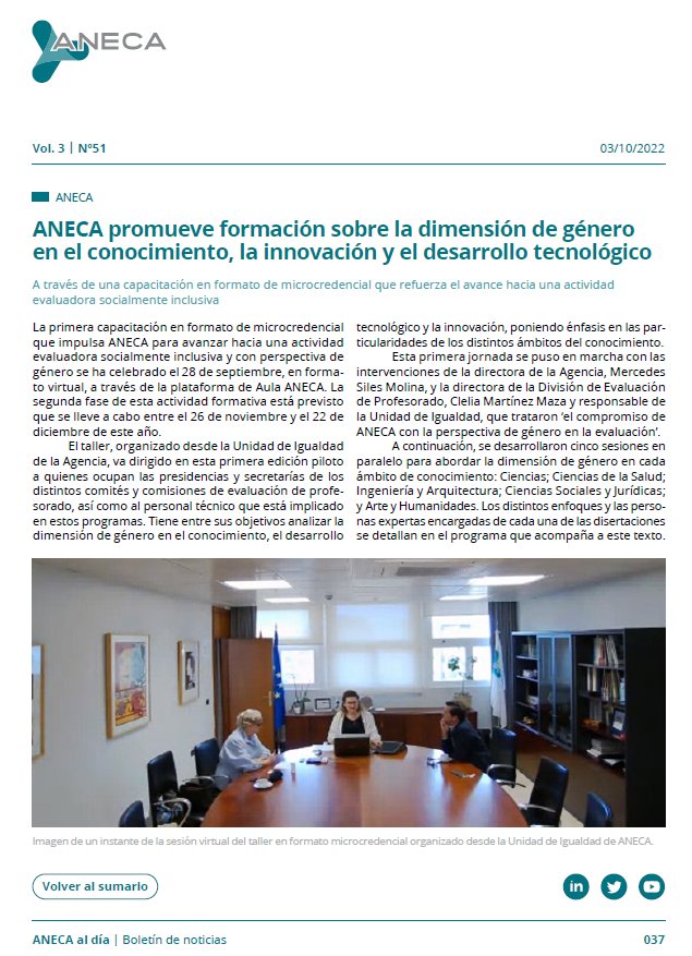 El Boletín nº 51 de ANECA al día se hace eco del taller organizado por la Unidad de Igualdad de la Agencia cuya primera capacitación en formato de microcredencial tuvo lugar el 28 de septiembre de 2022. El taller estuvo dirigido a las personas que ocupan las presidencias y secretarías de los distintos comités y comisiones de evaluación del profesorado, así como al personal técnico implicado en estos programas.