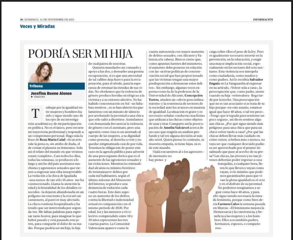 Torres-Díaz, María Concepción (2015). Nadie hablará de nosotras …, ¿o sí? En Agenda Pública para eldiario.es. Artículo en línea. Fecha de publicación: 25/10/2015. Artículo en pdf aquí: https://www.juristconcep.com/wp-content/uploads/2022/08/Torres-Diaz-Nadie-hablara-de-nosotras-…-o-si.-ELDIARIO.pdf. Versión del editor aquí: https://www.eldiario.es/agendapublica/blog/Nadie-hablara_6_445215490.html. En el repositorio académico RUA aquí: http://rua.ua.es/dspace/handle/10045/126096.