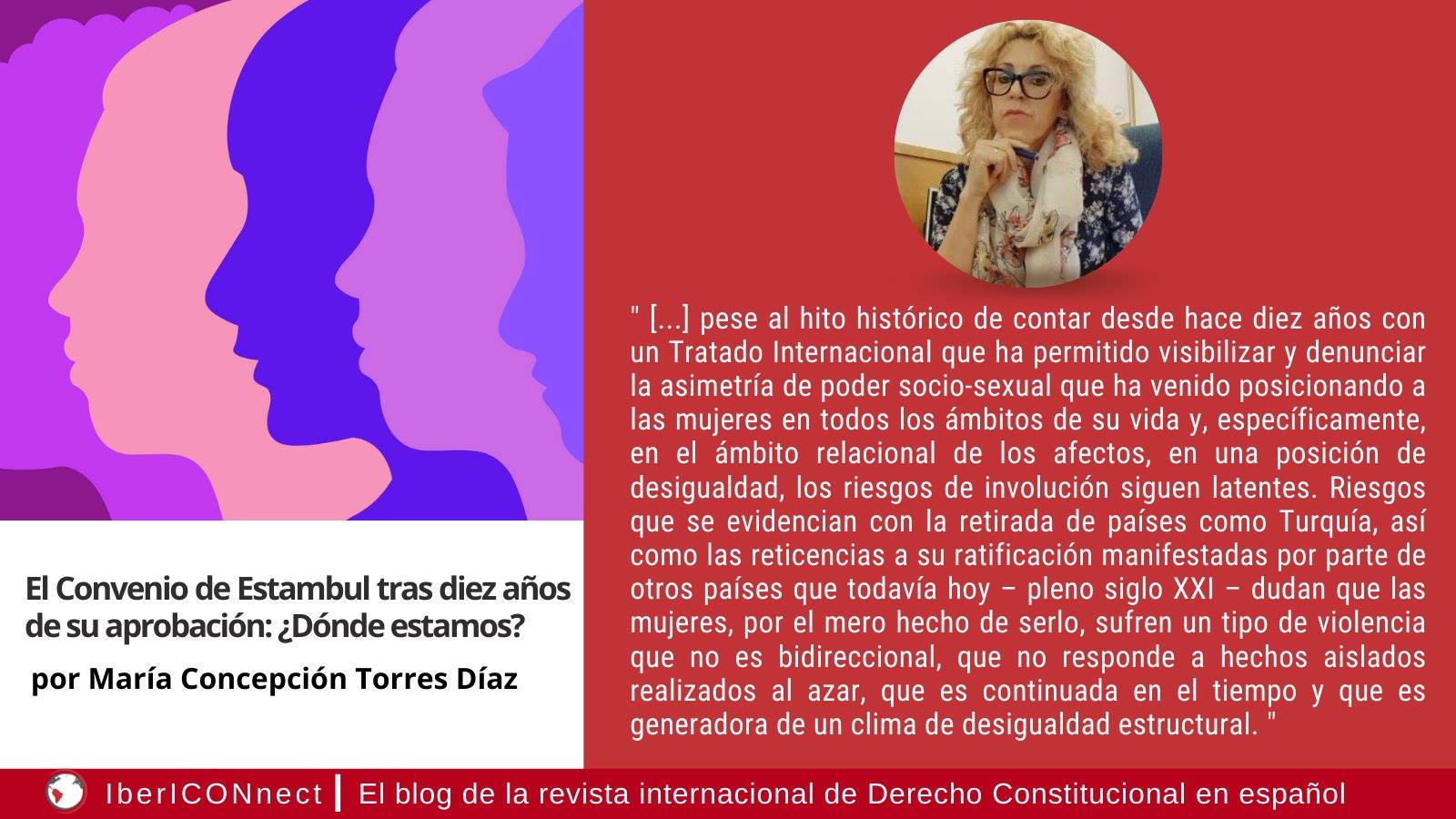 Torres-Díaz, María Concepción (2021). El Convenio de Estambul tras diez años de su aprobación, ¿dónde estamos? En IberICONnet. El Blog de la Revista Internacional de Derecho Constitucional en español. Artículo en línea. Fecha de publicación: 07/06/2021. Recuperado de: https://www.ibericonnect.blog/2021/06/el-convenio-de-estambul-tras-diez-anos-de-su-aprobacion-donde-estamos/. Artículo versión pdf aquí: https://www.juristconcep.com/wp-content/uploads/2022/06/ibericonnect.blog-El-Convenio-de-Estambul-tras-diez-anos-de-su-aprobacion-Donde-estamos.pdf. En el repositorio académico RUA aquí: https://rua.ua.es/dspace/handle/10045/124492. Nota-sinopsis: https://www.juristconcep.com/wp-content/uploads/2022/10/Convenio-Estambul.jpg.