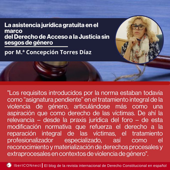 Torres-Díaz, María Concepción (2022). La asistencia jurídica gratuita en el marco del Derecho de Acceso a la Justicia sin sesgos de género. En IberICONnect. El Blog de la Revista Internacional de Derecho Constitucional en español. Artículo en línea. Fecha de publicación: 17/10/2022. Versión editor aquí: https://www.ibericonnect.blog/2022/10/la-asistencia-juridica-gratuita-en-el-marco-del-derecho-de-acceso-a-la-justicia-sin-sesgos-de-genero/. En formato pdf aquí: https://www.juristconcep.com/wp-content/uploads/2022/10/ibericonnect.blog-La-asistencia-juridica-gratuita-en-el-marco-del-Derecho-de-Acceso-a-la-Justicia-sin-sesgos-de-genero.pdf. En el repositorio académico RUA aquí: http://rua.ua.es/dspace/handle/10045/128534. Nota-sinopsis: https://www.juristconcep.com/wp-content/uploads/2022/10/Justicia-gratuita-y-sesgos-de-genero.jpeg.