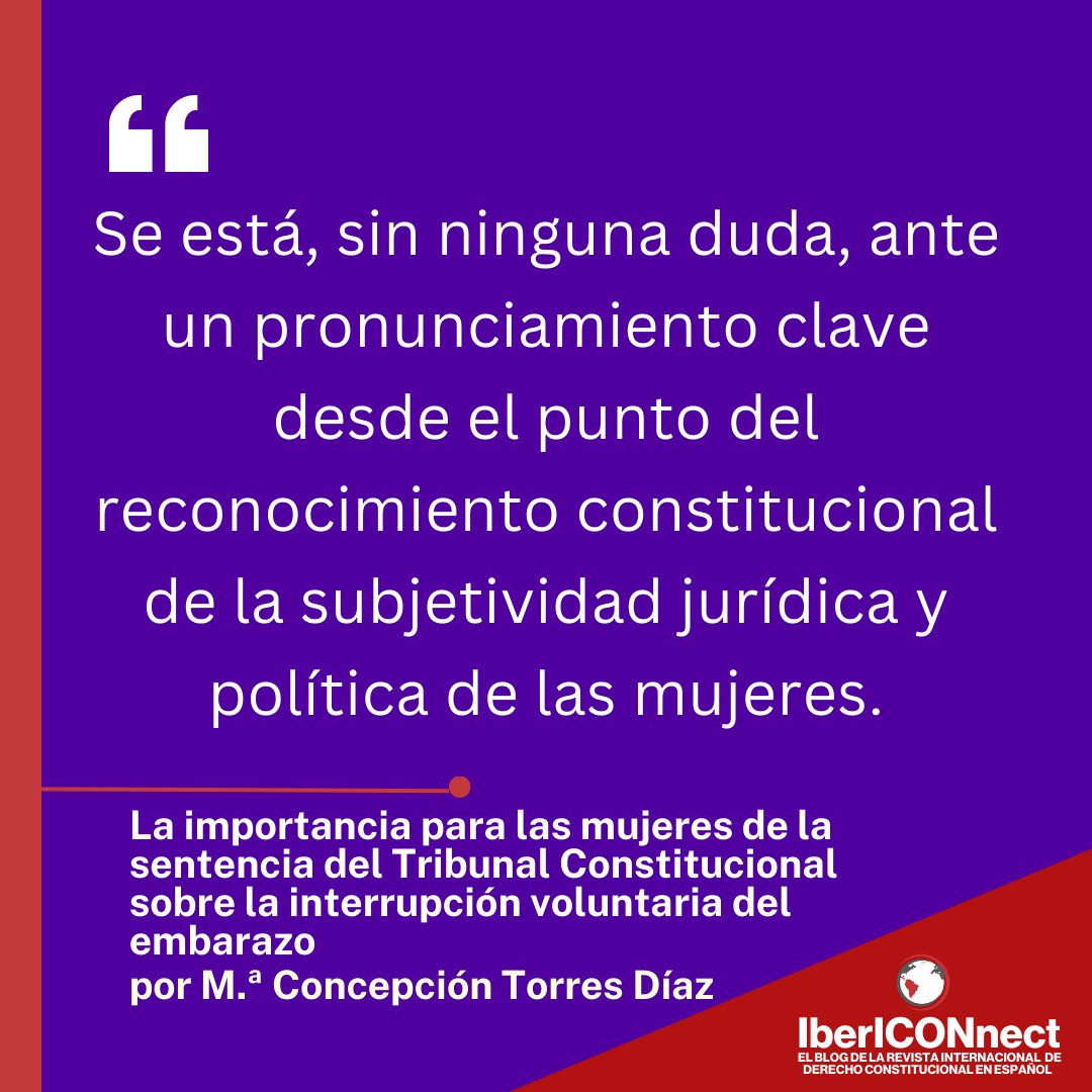 Torres-Díaz, María Concepción (2023). La importancia para las mujeres de la sentencia del Tribunal Constitucional sobre la interrupción voluntaria del embarazo, en IberICONnect. El Blog de la Revista Internacional de Derecho Constitucional en español. Artículo en línea. Fecha de publicación: 13/07/2023. Versión editor aquí: https://www.ibericonnect.blog/2023/07/la-importancia-para-las-mujeres-de-la-sentencia-del-tribunal-constitucional-sobre-la-interrupcion-voluntaria-del-embarazo/. En el repositorio académico RUA aquí: http://hdl.handle.net/10045/136118. Nota-sinopsis: https://www.juristconcep.com/wp-content/uploads/2023/07/ARTICULO-TORRES.jpeg. Nota-sinopsisbis: https://www.juristconcep.com/wp-content/uploads/2023/07/IBERICONNET.jpeg.