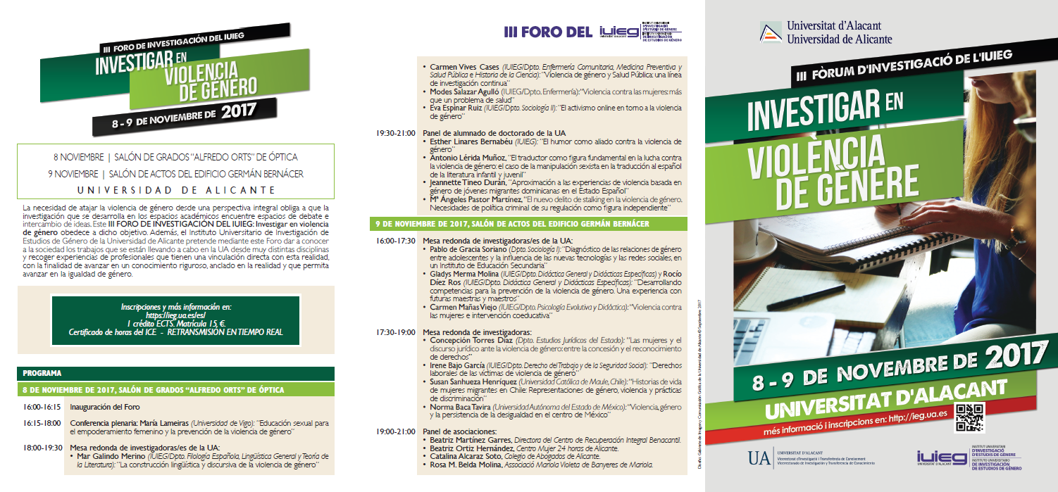 Más información: https://ieg.ua.es/es/congresos-y-seminarios/2017/iii-foro-de-investigacion-del-iuieg-investigar-en-violencia-de-genero.html