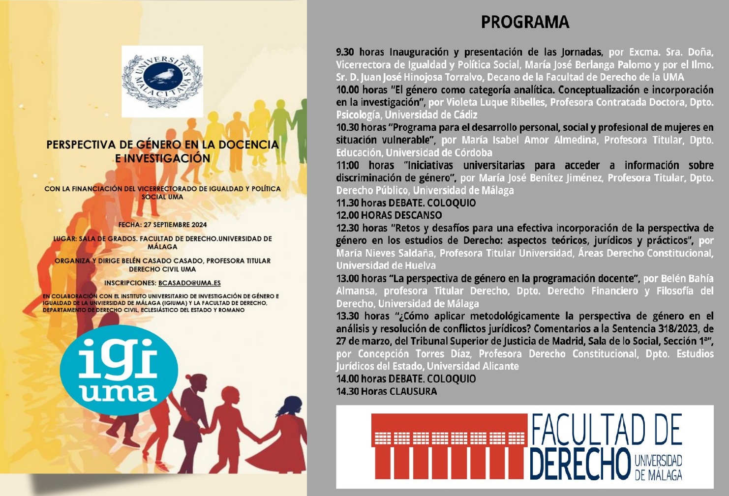 El próximo viernes 27 de septiembre de 2024 tendrá lugar las jornadas “Perspectiva de Género en la Docencia e Investigación” en la Sala de Grados de la Facultad de Derecho de la Universidad de Málaga. Estas han sido organizadas y dirigidas por la compañera Belén Casado Casado con financiación del Vicerrectorado de Igualdad y Política Social, en colaboración con nuestro Instituto y la Facultad de Derecho, Departamento de Derecho Civil, Eclesiástico del Estado y Romano.