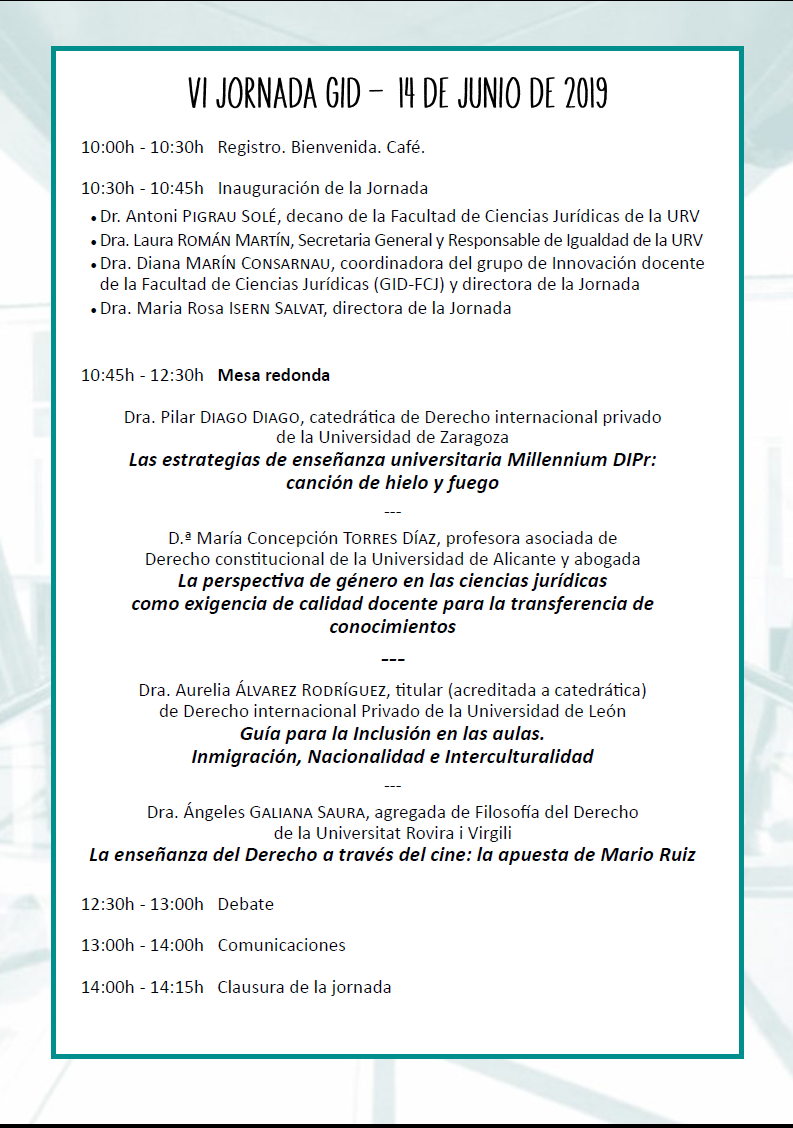 El 14 de junio de 2019 tuvo lugar en la Facultad de Ciencias Jurídicas de la URV (Tarragona) las VI Jornada de Innovación Docente bajo el siguiente rótulo «Retos jurídicos-sociales en la Unión Europea: de la investigación a la docencia». La profesora y abogada, D.ª Concepción Torres, participó en la mesa redonda con la siguiente ponencia invitada: «La perspectiva de género en las ciencias jurídicas como exigencia de calidad docente para la transferencia de conocimientos». Tras la exposición tuvo lugar un fructífero debate.