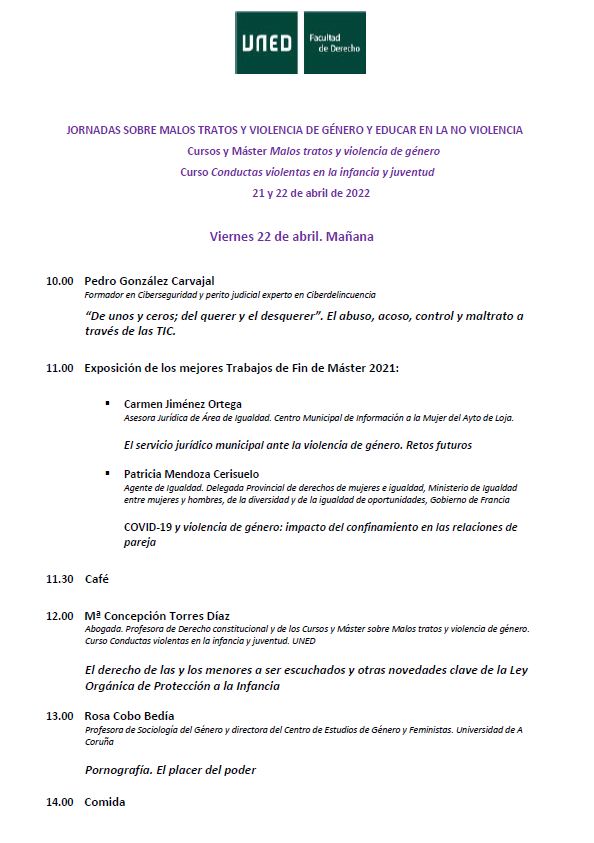 El próximo 22 de abril la profesora y abogada Dra. Concepción Torres participará en las jornadas sobre malos tratos y violencia de género, y educar en la no violencia que organiza la UNED en el marco de los cursos y Máster en Malos Tratos y Violencia de Género.