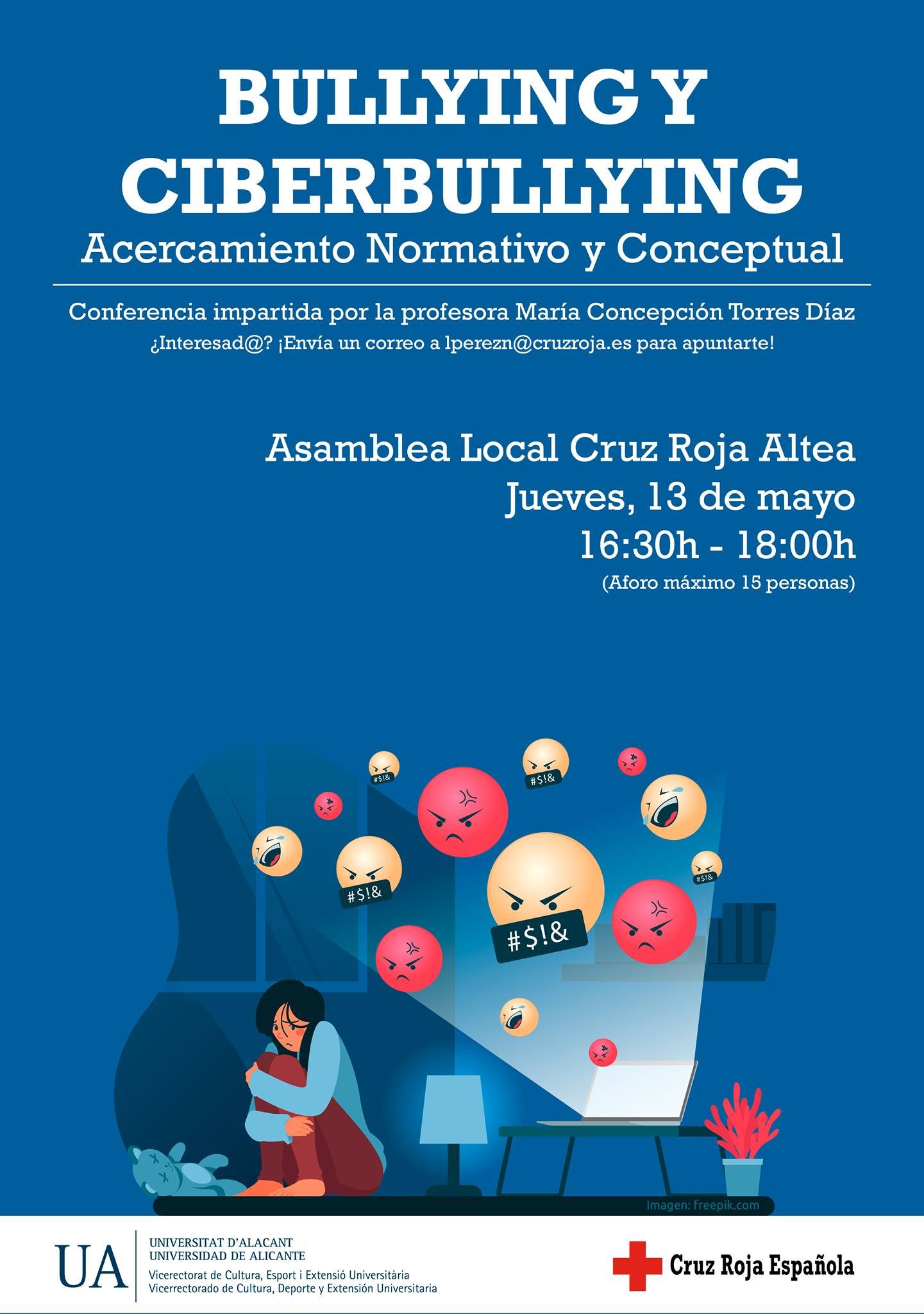 Próxima Conferencia enmarcada en el programa ordinario de conferencias de extensión universitaria con el objeto de contribuir a la divulgación del conocimiento que se genera la Universidad y dar respuesta a las demandas de los municipios de la provincia y de otras entidades e instituciones sin ánimo de lucro que canalizan sus propuestas a través de los ayuntamientos competentes, o directamente en el caso de que tengan un convenio firmado y en vigor con la Universidad de Alicante. Título de la conferencia: «Bullying y Ciberbullying: acercamiento normativo y conceptual». Información en pdf aquí. Más información aquí: https://web.ua.es/es/spcl/conferencias/ordinario/programa-ordinario-de-conferencias.html