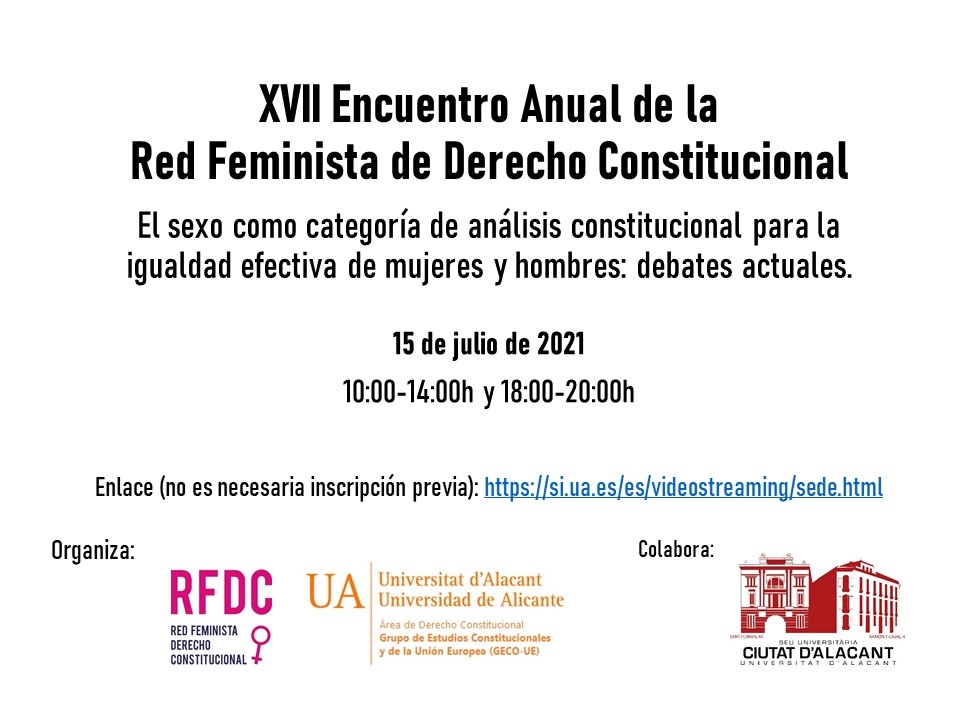 (233) Ponencia «La dimensión constitucional de los derechos sexuales y derechos reproductivos: a propósito de la LO 1/2023 y la STC 44-2023 del Tribunal Constitucional», en el XIX Encuentro Anual de la Red Feminista de Derecho Constitucional, 12-14 julio, Sede Universitaria de la Universidad de Alicante. Programa: https://www.juristconcep.com/wp-content/uploads/2023/07/Programa-XIX-Encuentro-2023-final-final.pdf. En prensa: https://web.ua.es/es/actualidad-universitaria/2023/julio2023/10-16/expertas-en-derecho-constitucional-abordan-en-la-sede-ciudad-de-alicante-los-derechos-sexuales-y-reproductivos.html. Más información: https://web.ua.es/es/sedealicante/galeria-de-fotos/2022-2023/otras/red-feminista/xix-encuentro-de-la-red-feminista-de-derecho-constitucional.html.