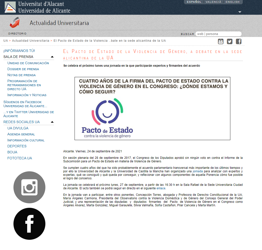 (184) Conferencia inaugural: «Los retos normativos ante la violencia de género: ¿Dónde estamos? Una revisión crítica sobre el estado normativo actual y propuestas de mejora», en la Jornada híbrida (presencial/online) «Cuatro años de la firma del Pacto de Estado contra la Violencia de Género. ¿Cómo hemos llegado hasta aquí y cómo continuar?», 27 septiembre 2021, Sede Universitaria Ramón y Cajal, Universidad de Alicante. Programa: https://s.ua.es/es/TXZP. Programa en pdf: https://www.juristconcep.com/wp-content/uploads/2021/09/PROGRAMA-27-SEP2021.pdf. Más información: https://web.ua.es/es/sedealicante/boletin-semanal/boletines-de-actividades-de-la-sede-2021-2022.html. En la Revista Actualidad Universitaria aquí: https://www.juristconcep.com/wp-content/uploads/2021/09/JORNADA-27-SEPTIEMBRE-2021.png. Grabación de la jornada en vértice UA: https://vertice.cpd.ua.es/252032. Vídeo-grabación en la Sede Universitaria UA: https://web.ua.es/es/aula-salud/salud-mujeres-y-genero-2021-2022/cuatro-anos-de-la-firma-del-pacto-de-estado-contra-la-violencia-de-genero-en-el-congreso-donde-estamos-y-como-seguir-27-septiembre-2021.html.