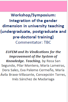 (183) Ponencia en el Symposium/Colloquium/Workshop «Eufem and its vindications for the improvement of the system of Knowledge, teaching», en la XI European Conference of Gender Equality in the Higher Education (Madrid, 15-17 september 2021). Programa: https://www.juristconcep.com/wp-content/uploads/2021/07/GEHE_Agenda_CET_july20.pdf. Intervenciones/Ponentes: https://www.juristconcep.com/wp-content/uploads/2021/09/Workshop.png. Más información: https://www.juristconcep.com/wp-content/uploads/2021/09/Teaching-EUFEM-AND-ITS-VINDICATIONS-2020.pdf. Web Congreso Internacional: https://upm.genderequalityconference2020.com/. Certificate as speaker: https://www.juristconcep.com/wp-content/uploads/2021/10/Certificados-symposium-GEHE-15.-CONCEPCION-TORRES.pdf.