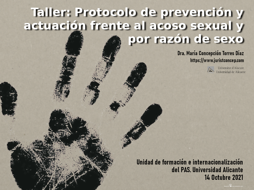 (187) Taller «Protocolo de prevención y actuación frente al acoso sexual, por razón de sexo y por orientación sexual» de la Universidad de Alicante, en el marco de la actividad «Acompañamiento formativo en procesos selectivos», dirigido al PAS de la Universidad de Alicante. Fecha: 14 octubre 2021. Horario: 16 a 18 horas. Vía Moodle y Webex. Más información aquí: Oferta admisión. Instituto de Ciencias de la Educación. Cartel-presentación: https://www.juristconcep.com/wp-content/uploads/2021/10/PORTADA-PROTOCOLO-UA.-Profa.-Dra.-Concepcion-Torres.png.