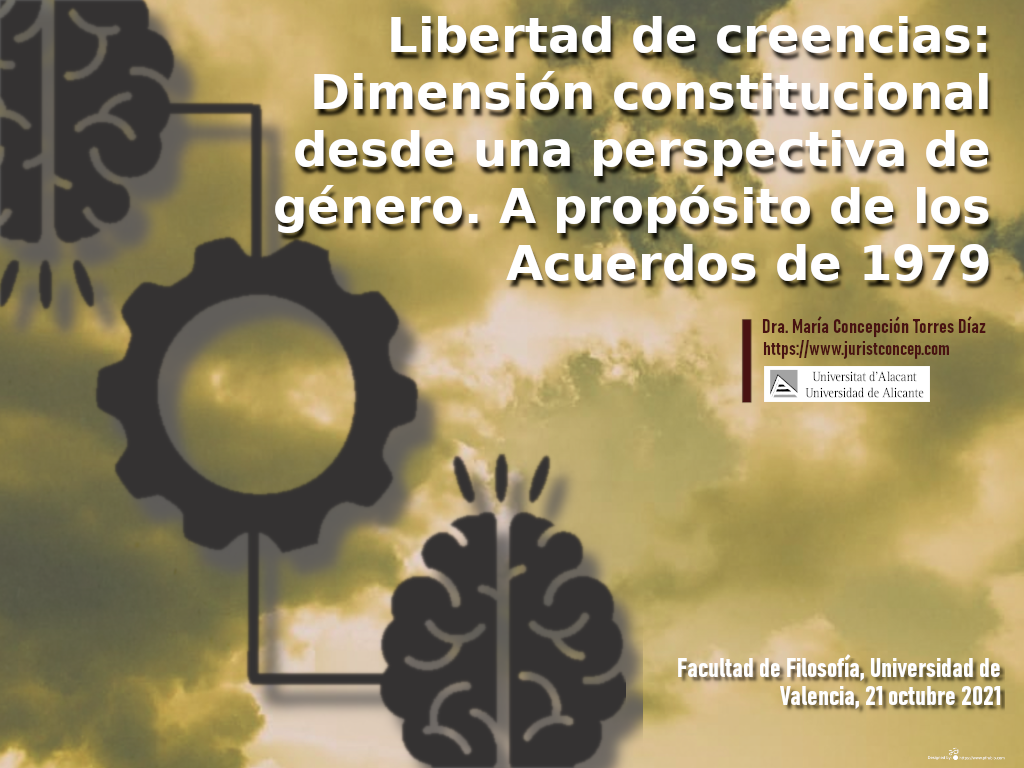 (189) Ponencia «Libertad conciencia / libertad de conciencia: dimensión constitucional desde una perspectiva de género. A propósito de los Acuerdos de 1979», en Jornadas Europa Laica: «¿Hasta cuándo los acuerdos con la Santa Sede» (dual presencial-online), 21 octubre 2021. Horario: 19 horas, Aula Magna de la Facultad de Filosofía y Ciencias de la Educación, Universitat Valencia. Programa: https://www.juristconcep.com/wp-content/uploads/2021/10/Cartel-en-pdf.pdf. Cartel de la jornada académica: https://www.juristconcep.com/wp-content/uploads/2021/10/Cartel-final.jpg. Sumario-presentación: https://www.juristconcep.com/wp-content/uploads/2021/10/Portada-Libertad-Creencias.-Profa.-Dra.-Concepcion-Torres.png. Más información aquí: https://laicismo.org/mesa-redonda-y-coloquio-en-la-universitat-de-valencia-el-proximo-jueves-21-hasta-cuando-los-acuerdos-de-1979-con-la-santa-sede-organizado-por-valencia-laica/251316.