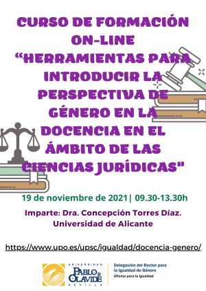 (192) Ponencia invitada – Taller «Herramientas para introducir la perspectiva de género en la docencia en el ámbito de las ciencias jurídicas», dirigido al PDI de la Facultad de Derecho de la Universidad Pablo de Olavide (Sevilla), 19 de noviembre de 2021. Más información: https://www.upo.es/desarrollo/pdi/acciones-formativas-2021/. Cartel formación: https://www.juristconcep.com/wp-content/uploads/2021/11/Curso-Prof.a-Dra-Concepcion-Torres.png. Información en pdf aquí: https://www.juristconcep.com/wp-content/uploads/2022/10/Politicas-Sociales-Igualdad-y-Cultura-Docencia-y-Genero-UPO.pdf.