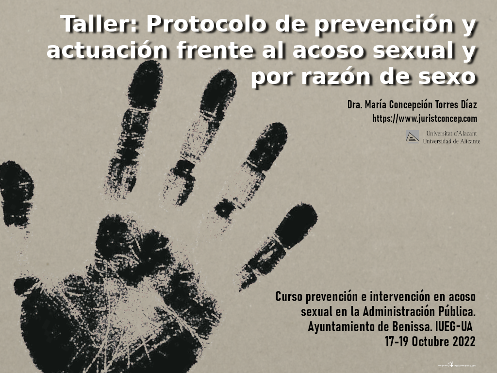 (216) Ponencia en el Curso Prevención e Intervención en acoso sexual en la Administración Pública. Responsable del Módulo 3. Protocolo de prevención y actuación frente al acoso sexual, por razón de sexo y por orientación sexual, Ayuntamiento de Benissa, 17 y 19 de octubre de 2022. Horario: de 12 a 14 horas. Información sobre el curso aquí: https://ieg.ua.es/es/investigacion/transferencia/curso-de-formacion-online-prevencion-e-intervencion-en-acoso-sexual-en-la-administracion-publica.html. Información curso en formato pdf: https://www.juristconcep.com/wp-content/uploads/2022/10/Curso-de-Formacion-Online-Prevencion-e-Intervencion-en-Acoso-Sexual-en-la-Administracion-Publica-IUIEG.pdf. Portada-presentación Módulo 3: https://www.juristconcep.com/wp-content/uploads/2022/09/PORTADA-PROTOCOLO-UA-OCTUBRE-2022.png. Programa-curso: https://www.juristconcep.com/wp-content/uploads/2022/09/PROGRAMA-ACOSO-BENISA-IUEG.pdf.