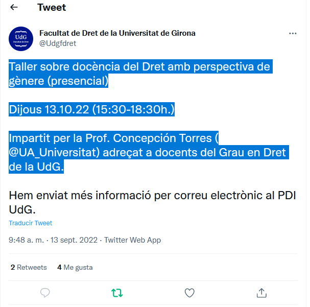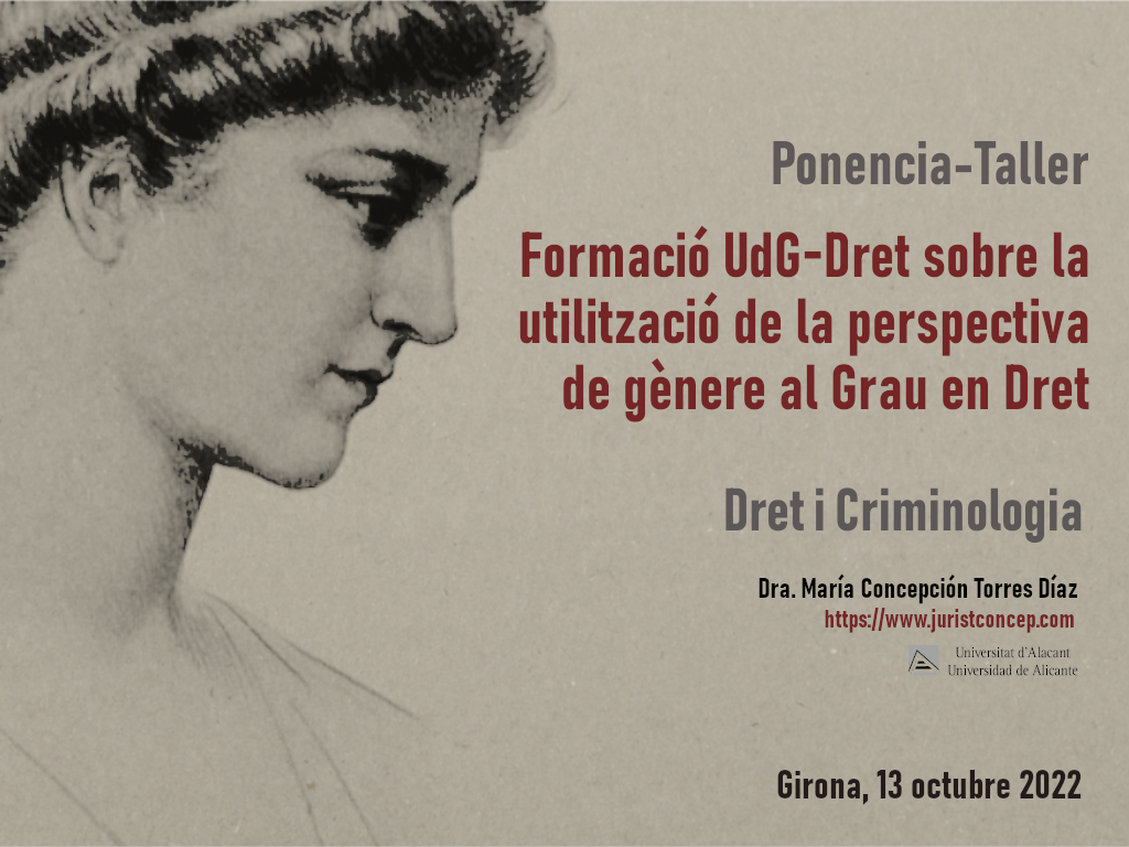 (215) Ponencia-taller presencial formació UdG-Dret sobre la utilització de la perspectiva de gènere al Grau en Dret, Facultat de Dret de la Universitat de Girona, 13 de octubre de 2022. Más información: https://www.juristconcep.com/wp-content/uploads/2022/09/PROGRAMA-TALLER.pdf. Información adicional: https://www.juristconcep.com/wp-content/uploads/2022/09/Twitter-Facultat-Dret-Universitat-Girona.png. Portada-presentación aquí: https://www.juristconcep.com/wp-content/uploads/2022/10/Ponencia-Girona-TORRES-DIAZ-MC.png. Más información aquí: https://www.udg.edu/es/ice/innovacio-docent/grups-dinnovacio-docent/gid-transversalitzacio-de-genere. Información adicional sobre innovación docente: https://www.udg.edu/ca/fd/innovacio
