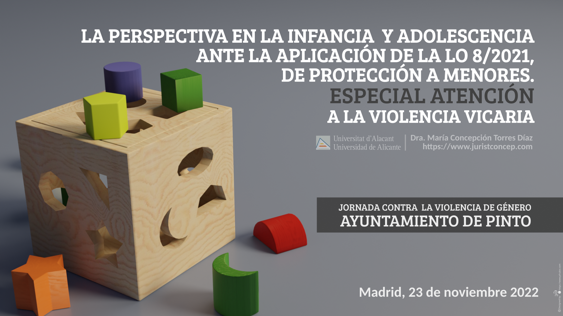 (220) Ponencia invitada: La perspectiva en la infancia y adolescencia ante la aplicación de la LO 8/2021, de protección a menores. Especial atención a la violencia vicaria, en las Jornadas feministas sobre violencia en menores, dirigida a profesionales: cómo afecta la violencia de género a las y los menores. Casa de la Cadena. Ayuntamiento de Pinto (Madrid). Fecha: 23 de noviembre de 2022. Programa: https://www.juristconcep.com/wp-content/uploads/2022/11/Violencia-genero-menores-1.jpg. Presentación-ponencia: https://www.juristconcep.com/wp-content/uploads/2022/10/Presentacion-Torres-Diaz-MC.png. Más información aquí: https://www.ayto-pinto.es/actualidad/-/publicador/noticias-actividades-y-propuestas-municipales-en-torno-al-25n/iF3JwwrCWEmd?p_p_auth=CI9Bbsq2&doAsUserId=162%2Fpolitica-privacidad%2Faviso-legal%2Fmapa-web. En formato pdf aquí: https://www.ayto-pinto.es/documents/20912/a9012ab2-8cd1-405c-b5f6-1968030a82e5.