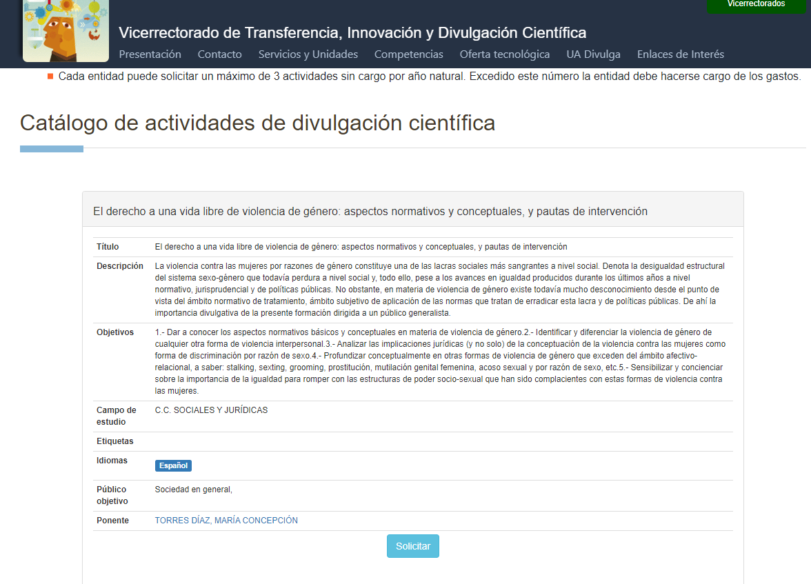 (2) Conferencia-taller: «El derecho a una vida libre de violencia de género: aspectos normativos y conceptuales, y pautas de intervención». Más información: https://lauavaalcole.ua.es/activities/648. Información adicional: https://web.ua.es/es/actualidad-universitaria/2025/enero2025/20-26/la-ua-lanza-mas-de-300-actividades-de-divulgacion-para-centros-de-educacion-y-entidades-de-toda-la-provincia.html. Convocatoria BOUA: CONVOCATORIA DEL PROGRAMA «LA UA VA AL COLE», ACTIVIDADES DE DIVULGACIÓN CIENTÍFICA DEL VICERRECTORADO DE TRANSFERENCIA, INNOVACIÓN Y DIVULGACIÓN CIENTÍFICA DE LA UNIVERSIDAD DE ALICANTE: https://www.boua.ua.es/es/acuerdo/53843