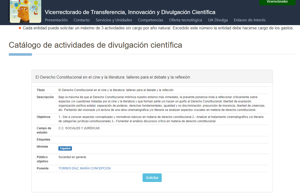 (1) Conferencia-taller: El Derecho Constitucional en el cine y la literatura: talleres para el debate y la reflexión. Más información: https://lauavaalcole.ua.es/activities/274. Programa web institucional: https://web.ua.es/es/vr-transferencia/divulgacion/conferencias-2023.html. Convocatoria BOUA 15/11/2022 aquí: https://www.boua.ua.es/es/acuerdo/31721. Logo UA: https://web.ua.es/es/vr-transferencia/imagenes/11f/divulga1-color-ua.png?noCache1639475794.