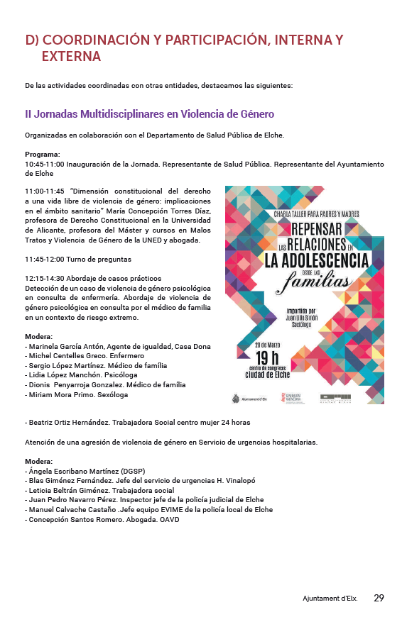 (69) Conferencia inaugural: «Políticas municipales de igualdad: una visión realista de nuestro entorno», en las I Jornadas Autonómicas de Buenas Prácticas Públicas en Igualdad, 28 de enero de 2016, Paterna (Valencia). Programa aquí. Díptico completo de las jornadas aquí. Vídeo de las Jornadas aquí.
