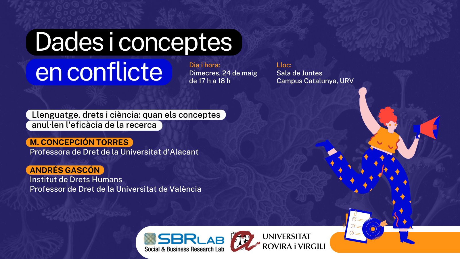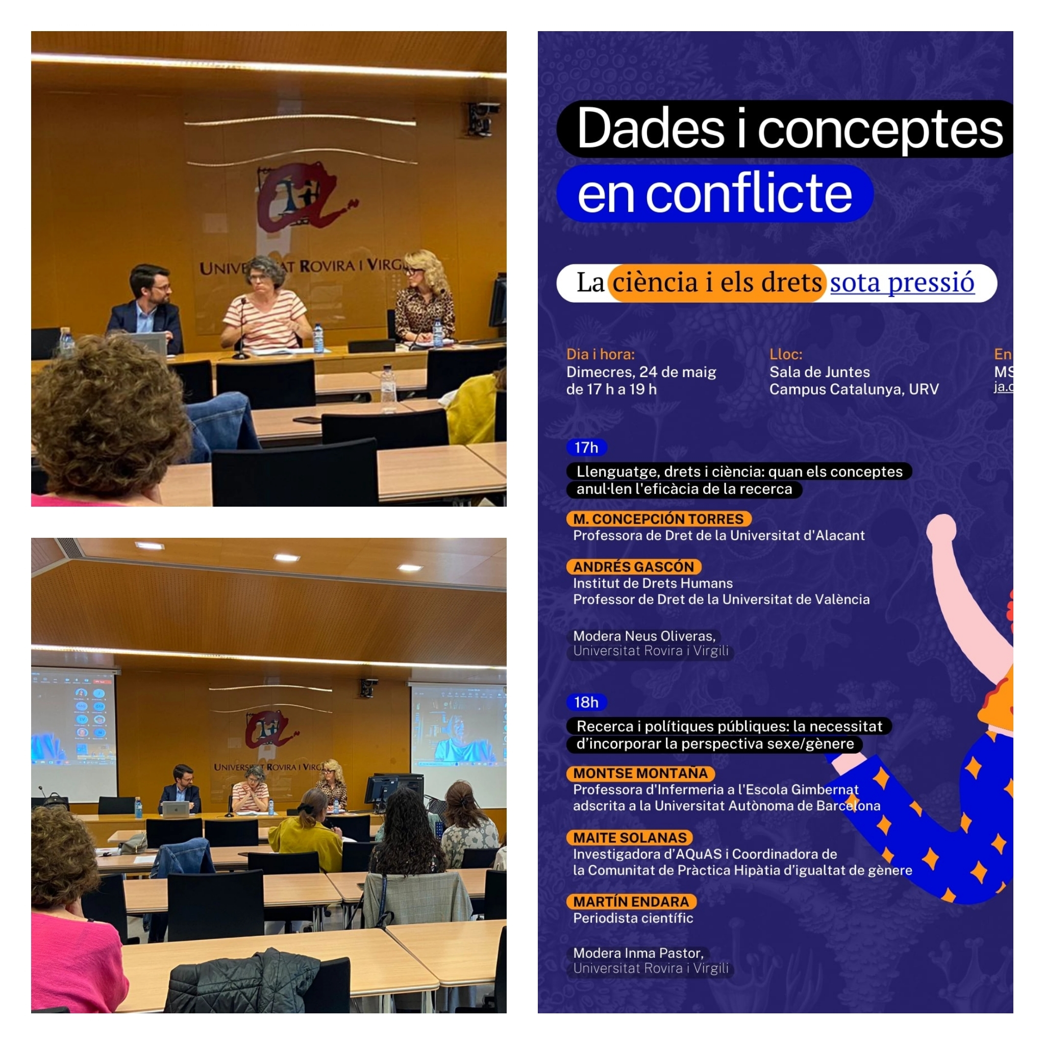 (231) Intervención en Mesa Redonda «Dades i conceptes en conflicte: la ciència i els drets sota pressió. Datos y conceptos en conflicto: la ciencia y los derechos bajo presión«. Dimecres 24 de maig de 17h a 19h Sala de Juntes. Campus Catalunya Universitat Rovira i Virgili Organitza: Social and Business Research Laboratory. Programa: https://www.juristconcep.com/wp-content/uploads/2023/05/PROGRAMA-JORNADA-TARRAGONA.pdf. Cartel: https://www.juristconcep.com/wp-content/uploads/2023/05/CARTEL.jpeg. Más información aquí: https://agenda.urv.cat/agenda/show_event/99907/dades-i-conceptes-en-conflicte-la-ciencia-i-els-drets-sota-pressio.html. Sobre la jornada: https://www.juristconcep.com/wp-content/uploads/2025/10/JORNADA-MAYO-2023.png
