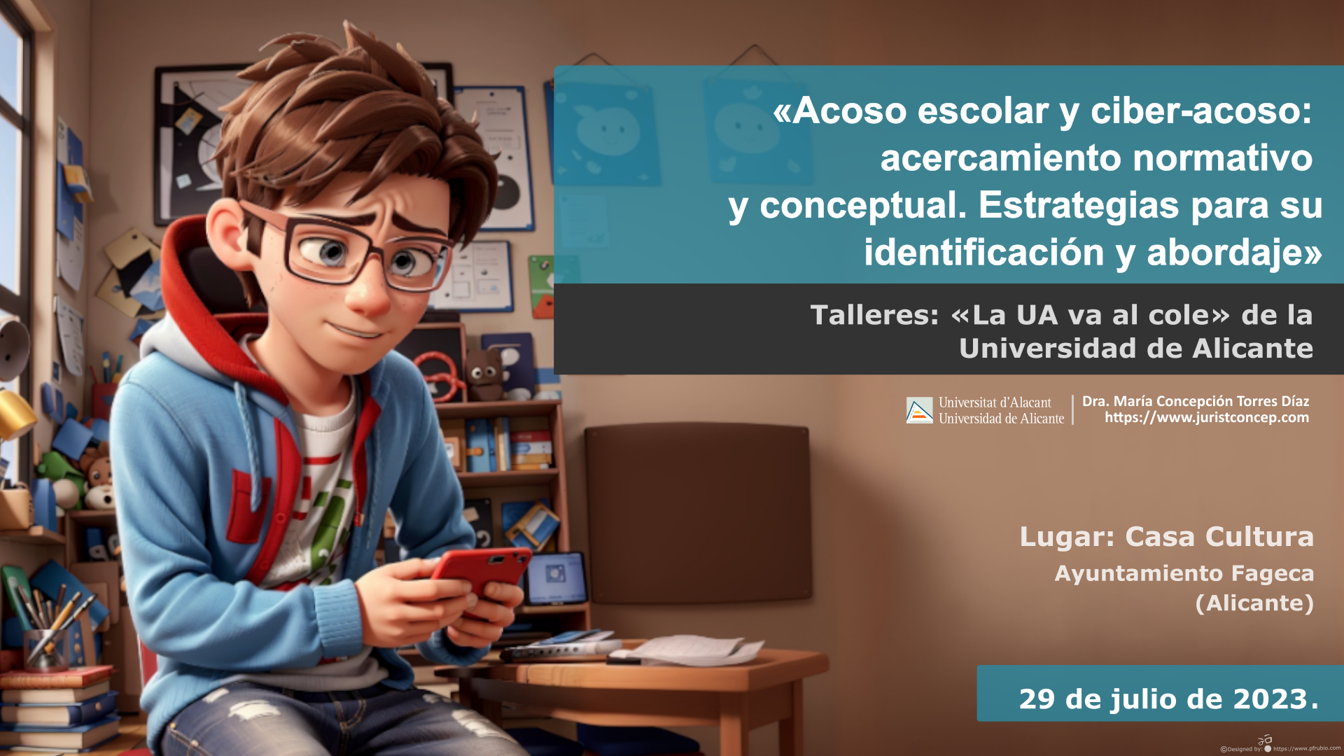 (234) Ponencia – charlar «Acoso escolar y ciber-acoso: acercamiento normativo y conceptual. Estrategias para su identificación y abordaje», en el marco de las actividades «UA Divulga» de la Universidad de Alicante. Lugar Casa Cultura del Ayuntament Fageca (Alicante), 29 de julio de 2023. Hora: 11 horas. Más información: https://www.juristconcep.com/wp-content/uploads/2023/07/PONENCIA-TORRES-DIAZ.png. Más información aquí: https://lauavaalcole.ua.es/activities/271.