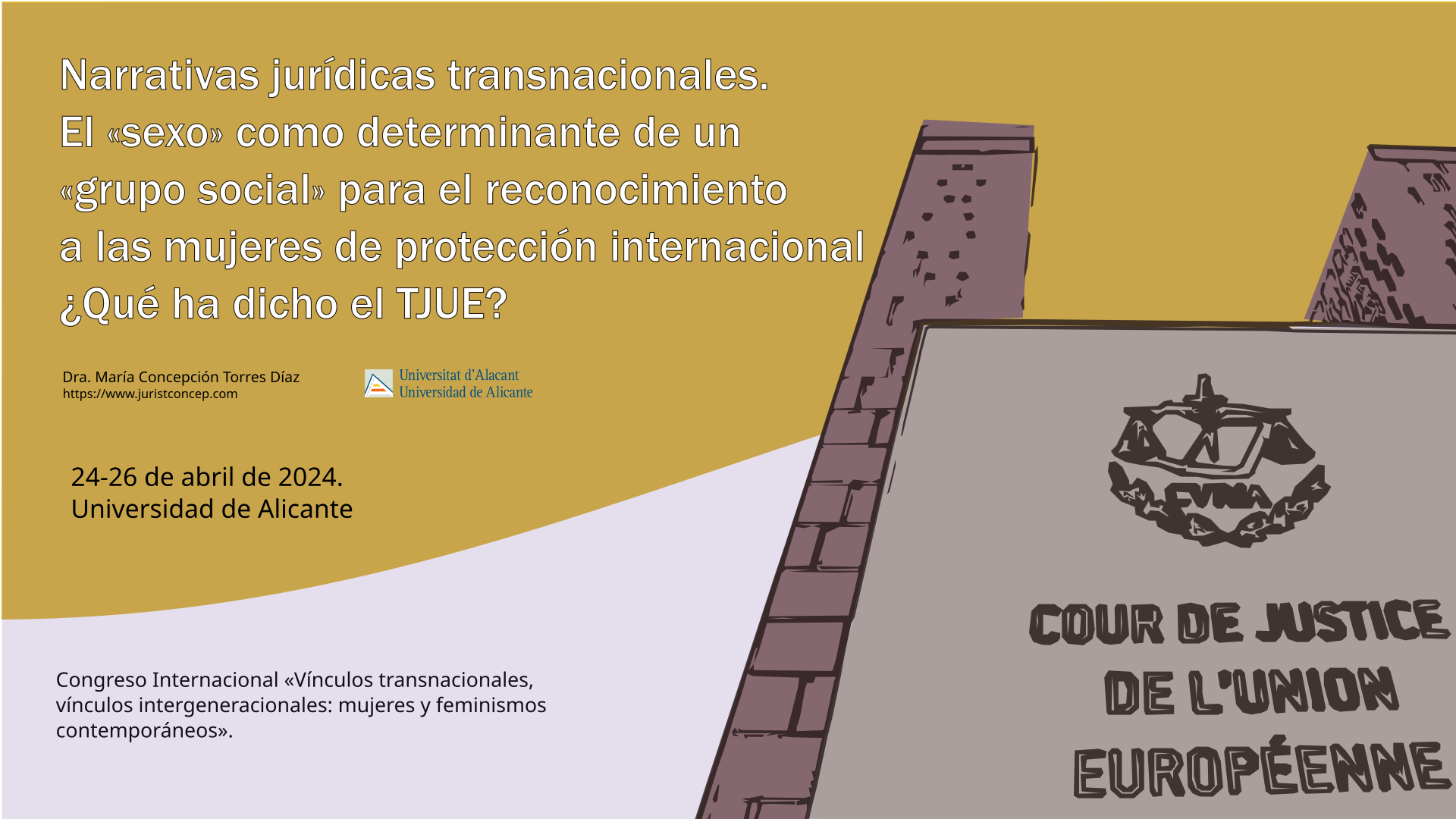 (243) Comunicación aceptada por el Comité Científico en Congreso Internacional «Vínculos transnacionales, vínculos intergeneracionales: mujeres y feminismos contemporáneos», 24-26 de abril de 2024. Universidad de Alicante. Título de la comunicación: Narrativas jurídicas transnacionales. El «sexo» como determinante de un «grupo social» para el reconocimiento a las mujeres de protección internacional, ¿Qué ha dicho el Tribunal de Justicia de la UE?. Paneles de comunicaciones aquí: https://www.juristconcep.com/wp-content/uploads/2024/03/2.-Paneles-comunicaciones-Congreso-Vinculos.pdf. Más información aquí: https://s.ua.es/es/-MnI. Presentación-ponencia: https://www.juristconcep.com/wp-content/uploads/2024/04/PONENCIA-TORRES-DIAZ-MC-2024.png
