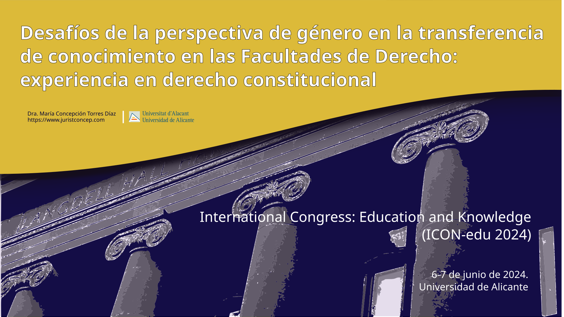 (246) Comunicación aceptada por el Comité Científico en el International Congress: Education and Knowledge (ICON-edu 2024). Título de la comunicación-ponencia: «Desafíos de la perspectiva de género en la transferencia de conocimiento en las Facultades de Derecho: experiencia en derecho constitucional» . Fecha de celebración: 6-7 junio 2024, Facultad de Educación de la Universidad de Alicante y Sede Universitaria de La Nucía (Alicante). Ponencia-presentación: https://www.juristconcep.com/wp-content/uploads/2024/04/Ponencia-Torres-Diaz-2024.png. Programa completo aquí: https://icon.kiobus.org/edu/wp-content/uploads/2024/06/PROGRAMA_WEB_CONGRES_ICON-edu_2024.pdf. Más información: https://icon.kiobus.org/edu/. Libro de Actas aquí: https://octaedro.com/libro/actas-proceedings-actes-3nd-international-congress-education-and-knowledge/