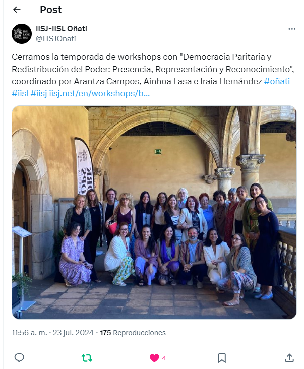 (249) Ponencia en la Bilkura «Democracia paritaria, y redistribución del poder: presencia, representación y reconocimiento», en el Instituto Internacional de Sociología Jurídica de Oñati (País Vaco), 22-24 de julio de 2024.. Título de la ponencia: Academic housework: narratives of the self as a methodology for dealing with experiences of «no power» and «no place» in academia. Programa: https://www.juristconcep.com/wp-content/uploads/2024/07/PROGRAMA-FINAL-ONATI-JULIO-2024.pdf. Abstracts de las ponencias: https://www.juristconcep.com/wp-content/uploads/2024/07/ABSTRACTS-PONENCIAS-ONATI-2024.pdf. Más información aquí: https://www.iisj.net/es/workshops/bilkura-democracia-paritaria-y-redistribuci%C3%B3n-del-poder-presencia-representaci%C3%B3n-y-0. Información adicional: https://www.juristconcep.com/wp-content/uploads/2024/07/Workshops-Democracia-Paritaria-y-Redistribucion-del-Poder-Onati-julio-2024.png