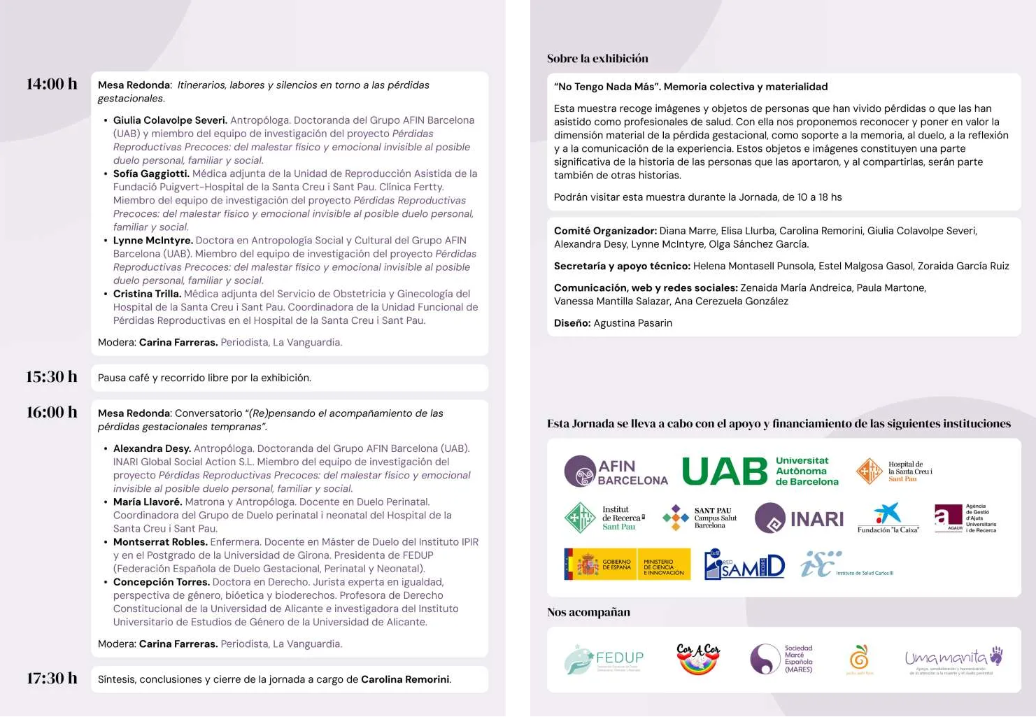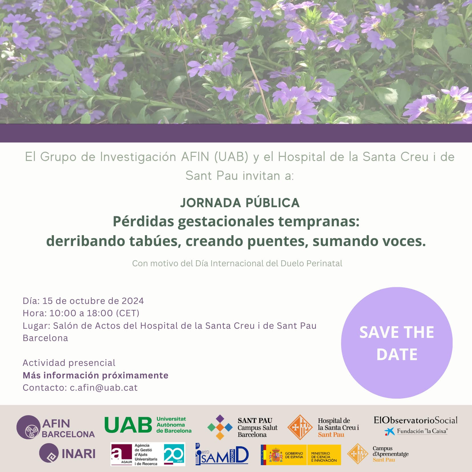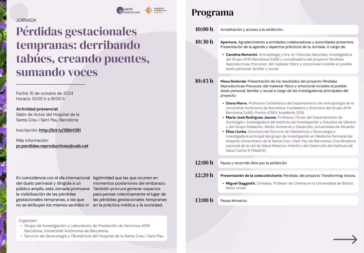 (252) Ponencia en la Jornada pública Pérdidas gestacionales tempranas: derribando tabúes, creando puentes, sumando voces. Con motivo del Día Internacional del Duelo Perinatal. Lugar: Salón de Actos del Hospital de la Santa Creu i de Sant Pau (Barcelona). Día: 15 de octubre de 2024. Cartel aquí: https://www.juristconcep.com/wp-content/uploads/2024/09/PROGRAMA-BARCELONA-OCT-2024.jpg. Programa1: https://www.juristconcep.com/wp-content/uploads/2024/10/PROGRAMA-BARCELONA-OCT-20241.png. Programa 2: https://www.juristconcep.com/wp-content/uploads/2024/10/PROGRAMA-BARCELONA-OCT-20242.png. PROGRAMA COMPLETO (pdf): https://www-balan.uab.cat/Document/513/778/Programa,15.pdf. Más información: https://afin-barcelona-uab.eu/el-grupo-afin-barcelona-y-el-hospital-de-la-santa-creu-i-sant-pau-invitan-a-la-jornada-perdidas-gestacionales-tempranas-derribando-tabues-creando-puentes-sumando-voces/. Referencia en el Informe AFIN nº 150 (pp. 18-19) aquí: https://ddd.uab.cat/pub/afin/afinSPA/afin_a2024m12n150iSPA.pdf. En YouTube aquí: https://www.youtube.com/watch?v=BWxj9dlDrs0. Identificador académico RUA: http://hdl.handle.net/10045/160240