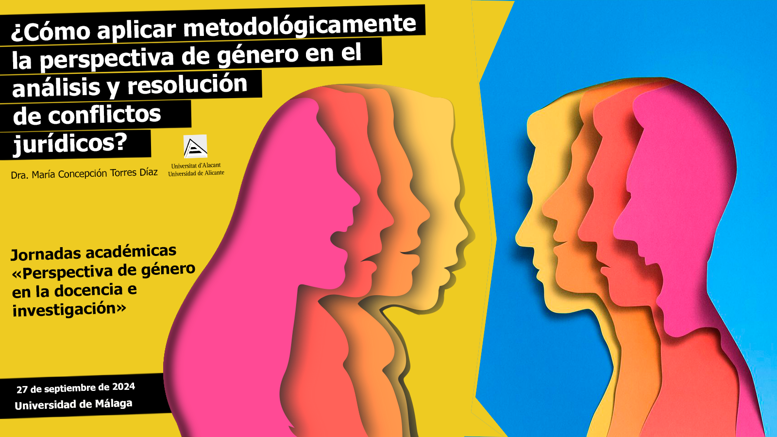 (251) Ponencia en las Jornadas académicas «Perspectiva de género en la docencia e investigación», con la financiación del Vicerrectorado de Igualdad y Política Social de la Universidad de Málaga. Título de la ponencia: «¿Cómo aplicar metodológicamente la perspectiva de género en el análisis y resolución de conflictos jurídicos?». Facultad de Derecho de la Universidad de Málaga, 27 de septiembre de 2024. Programa: https://www.juristconcep.com/wp-content/uploads/2024/09/CARTEL-PERSPECTVA-DE-GENERO-EN-LA-DOCENCIA-E-INVESTIGACION.pdf. Ponencia: https://www.juristconcep.com/wp-content/uploads/2024/09/TORRES-DIAZ-MC-PONENCIA-SEPT-2024.png. Más información: https://www.uma.es/instituto-universitario-de-investigacion-de-genero-e-igualdad/noticias/jornadas-perspectiva-de-genero-en-la-docencia-e-investigacion/.