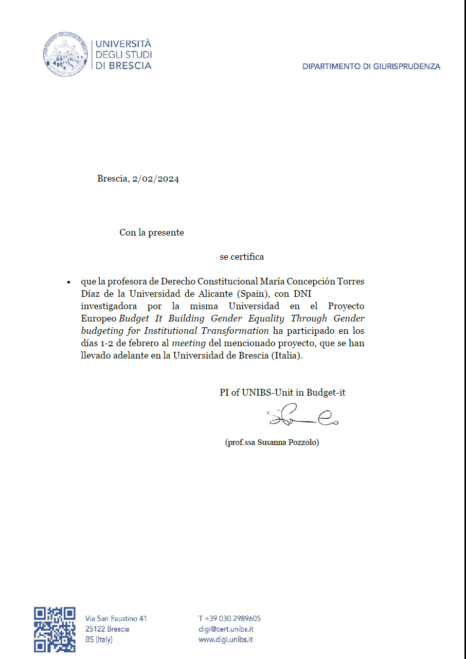 (241) Participación en calidad de investigadora por la Universidad de Alicante en el BUDGET-IT CONSORTIUM MEETING AGENDA. Faculty of Law University of Brescia, 31 January-2 February. Programa provisional: https://www.juristconcep.com/wp-content/uploads/2024/01/CONSORTIUM-MEETING-AGENDA-UNIBS-31-jan-2-feb-2024.pdf. . Certificado participación: https://www.juristconcep.com/wp-content/uploads/2025/10/CERTIFICADO-BUDGET-IT-BRESCIA-TORRES-DIAZ-MC.png. Más información aquí: https://budget-it.eu/. Información adicional sobre el Proyecto Europeo: https://observatorio-cientifico.ua.es/proyectos/1036744/detalle