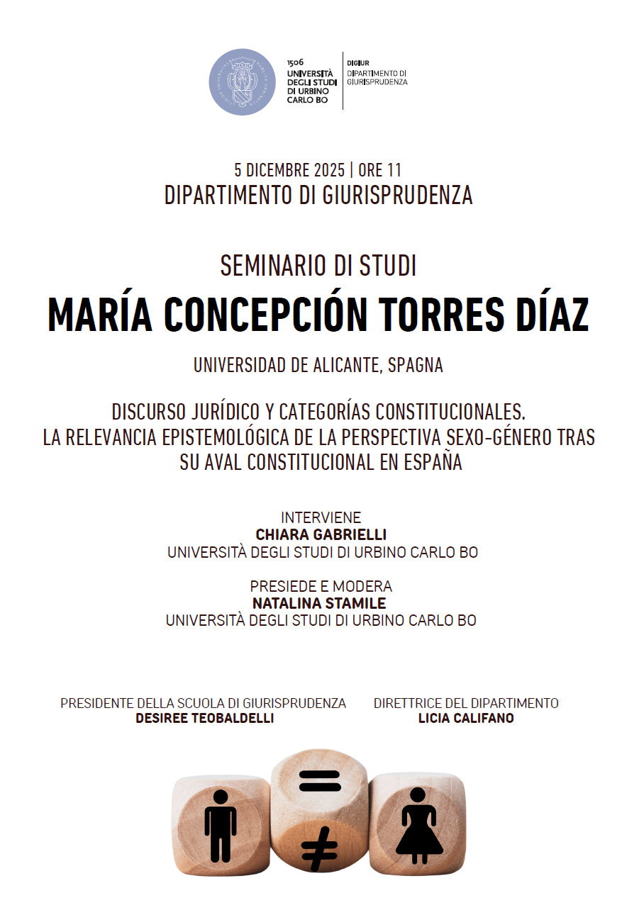 (265) Ponencia «Discurso jurídico y categorías constitucionales. La relevancia epistemológica de la perspectiva sexo-género tras su aval constitucional en España», en el Seminario di Studi del Dipartimento di Giurisprudenza de la Università Degli Studi Di Urbino Carlo Bo (Italia). Fecha: 05/12/2025. Programa: https://www.juristconcep.com/wp-content/uploads/2025/11/PONENCIA-ITALIA.png. Cartel: https://www.juristconcep.com/wp-content/uploads/2025/11/PONENCIA-ITALIA.png. Más información aquí: https://www.uniurb.it/it/portale/dipartimento-index.php?mist_id=15300&tipo=DIGIUR&page=2442&term_taxonomy_id=13.