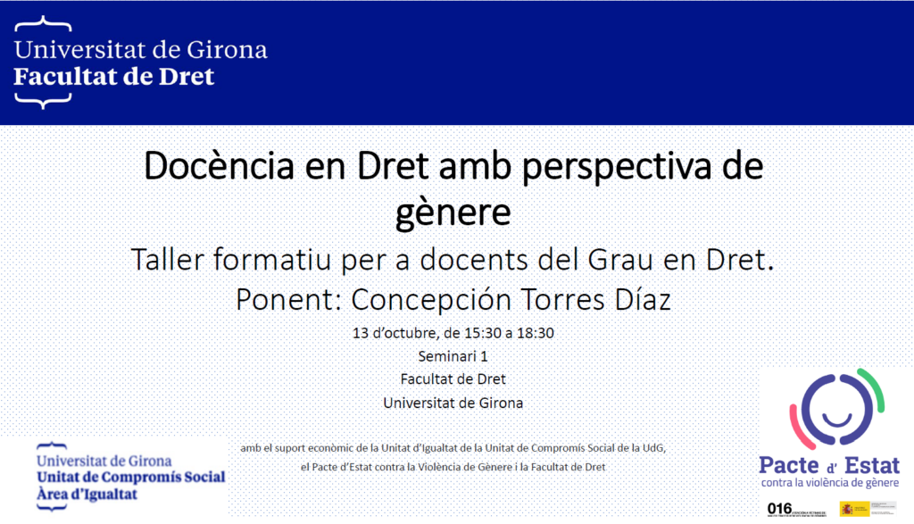 El próximo 13 de octubre la profesora y abogada, Dra. Concepción Torres, participará como ponente invitada en el taller formació UdG-Dret sobre la implementación de la perspectiva de género como metodología de análisis jurídico en el Grado de la Derecho de la Facultad de Derecho de la Universidad Girona.