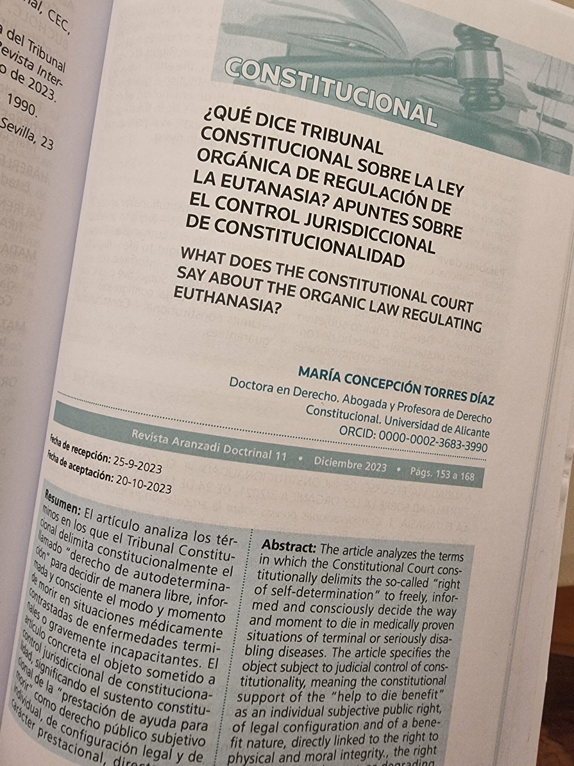 El número 11 de la Revista Aranzadi Doctrinal publica el artículo de análisis jurisprudencial de la profesora Dra. M.ª Concepción Torres. Lleva por título: ¿Qué dice el Tribunal Constitucional sobre la LO de regulación de la eutanasia? Apuntes sobre el control jurisdiccional de constitucionalidad.