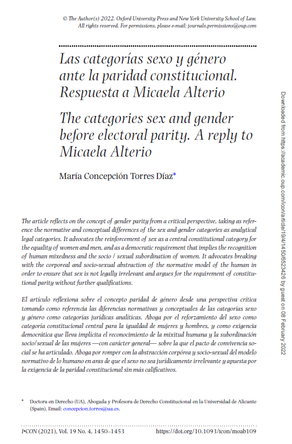 El artículo de la profesora Dra. Concepción Torres, Las categorías sexo y género ante la paridad constitucional. Respuesta a Micaela Alterio. The categories sex and gender before electoral parity. A reply to Micaela Alterio, publicado en International Journal of Constitutional Law, Volume 19, Issue 4, October 2021, Pages 1450–1453, https://doi.org/10.1093/icon/moab109. Published: 07 February 2022.
